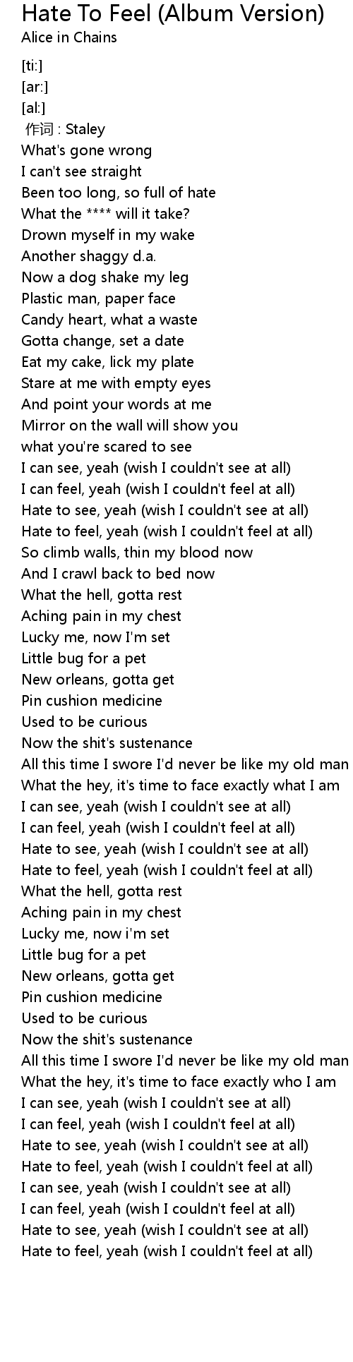 | [04:41.77] | Hate to feel, yeah (wish I couldn't feel at all) |