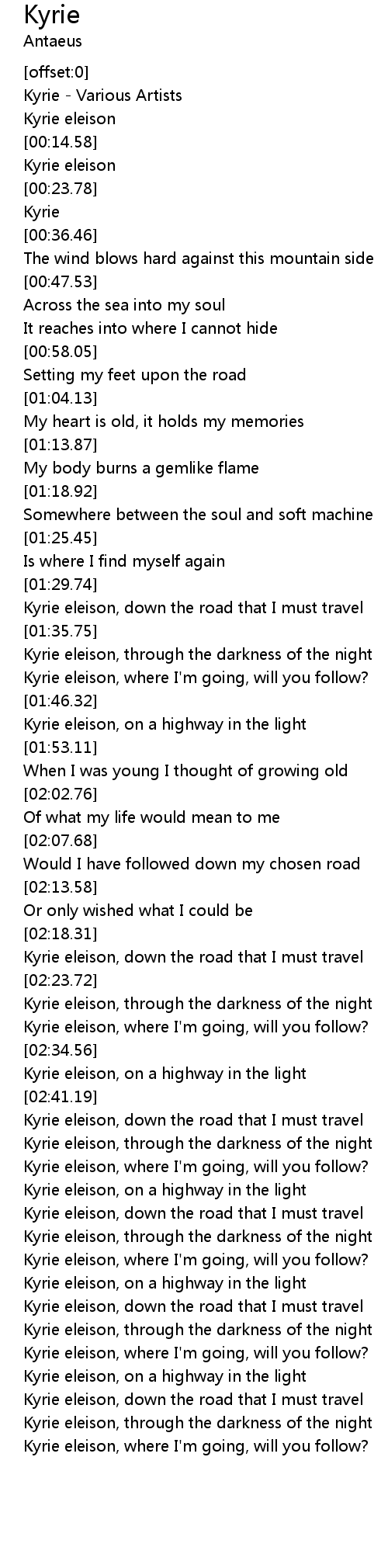 Kyrie eleison, down the road that I must travel |