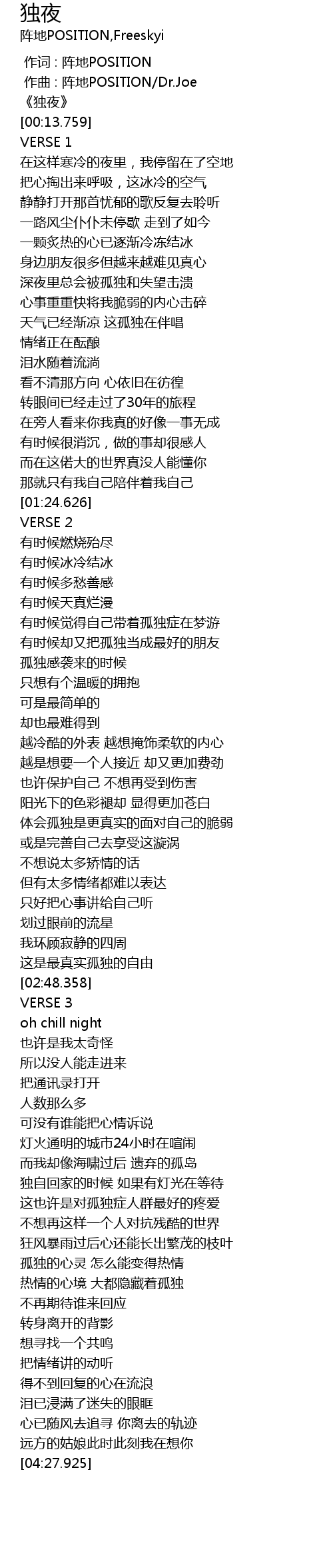 | [00:28.248] | zài zhè yàng hán lěng de yè lǐ, wǒ tíng liú zài le kòng dì |