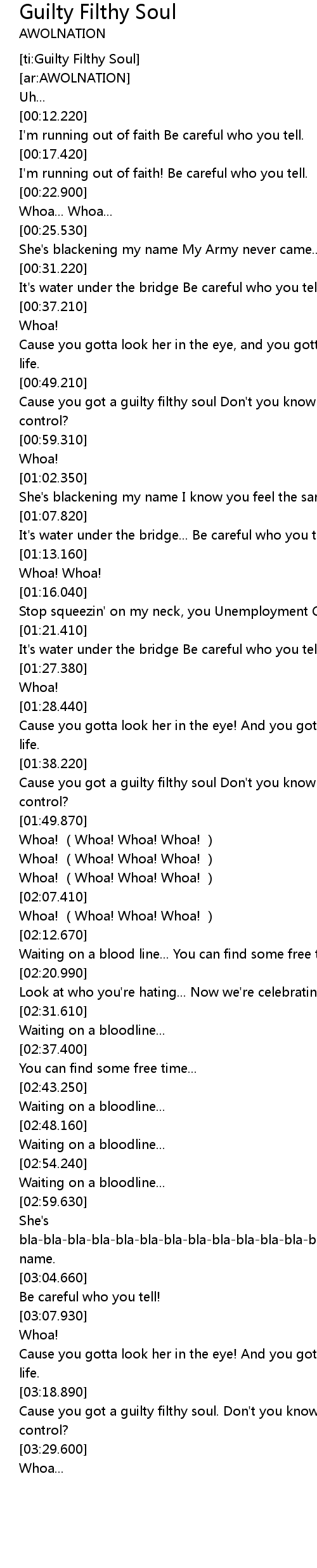 | [01:40.170] | Cause you got a guilty filthy soul Don' t you know it' s out of your control? |