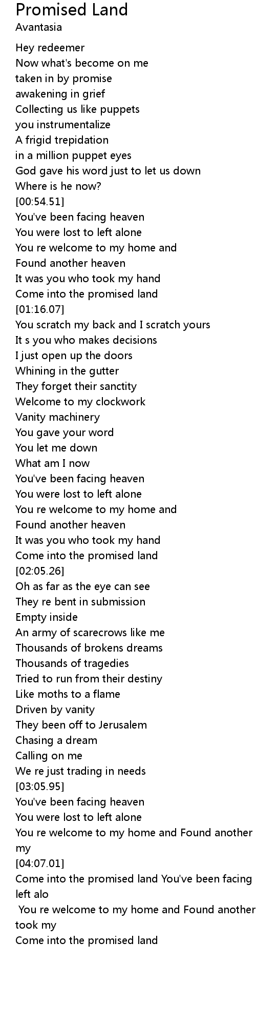 [04:07.57] Come into the promised land You've been facing heaven You were lost to left alo