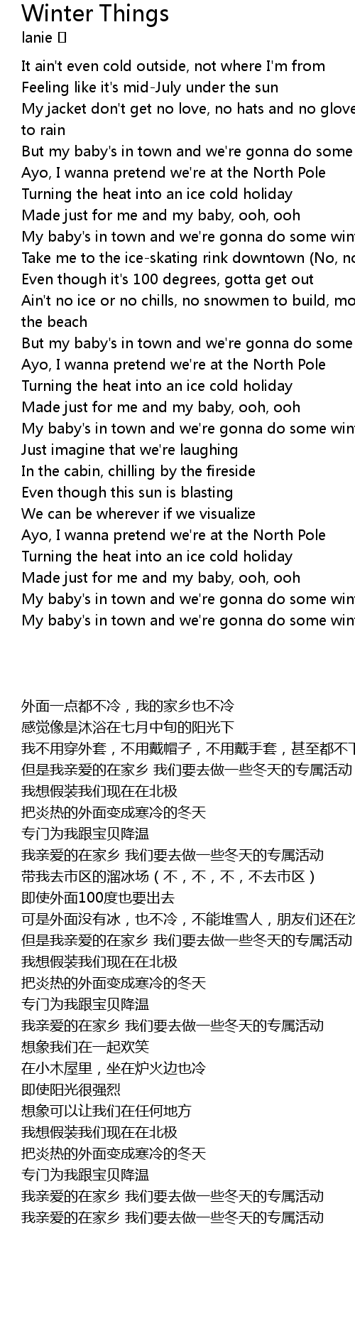 My jacket don't get no love, no hats and no gloves, not even a chance to rain |
