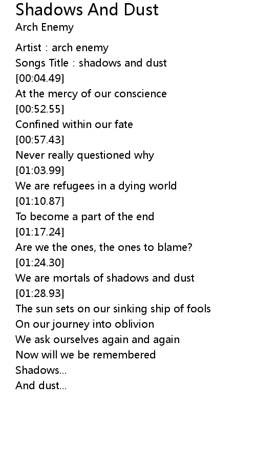 | [00:02.72] | Songs Title: shadows and dust |