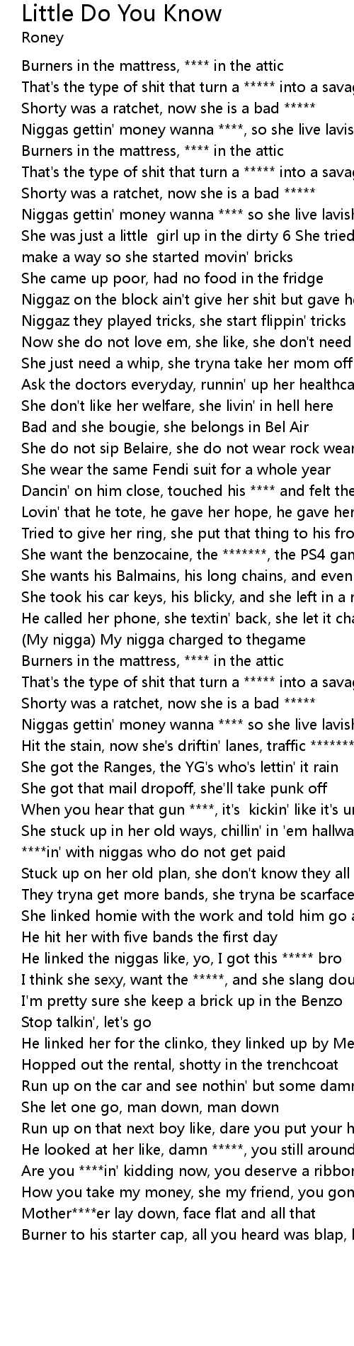 | [00:51.178] | Niggaz on the block ain't give her shit but gave her **** |