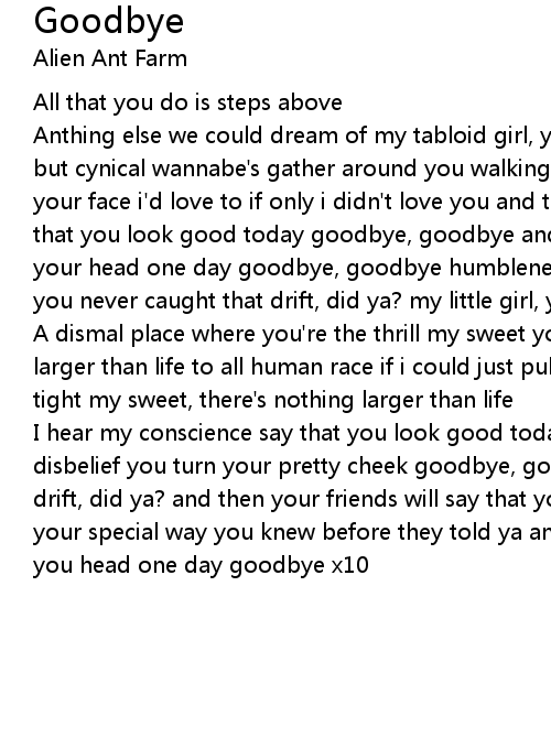 I hear my conscience say that you look good today goodbye, goodbye and then to disbelief you turn your pretty cheek goodbye, goodbye you never caught that drift, did ya? and then your friends will say that you look good today and in your special way you knew before they told ya and then with no delay you turned you head one day goodbye x10 |