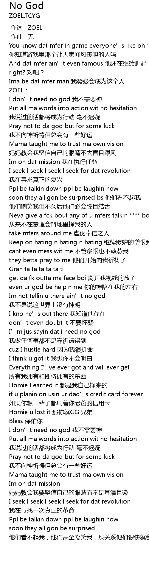 | [00:53.660] | I’m jus sayin dat i need no god 我做任何事都不是靠祈祷得到 |