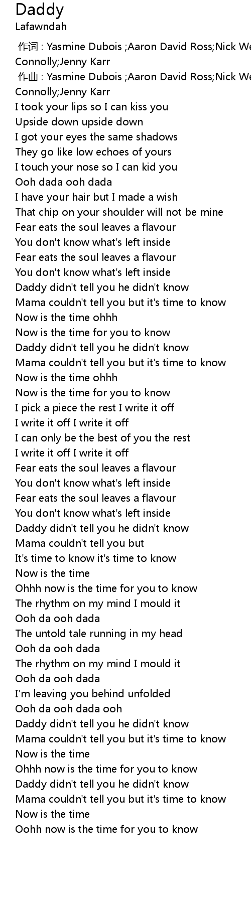 | [02:01.179] | Daddy didn't tell you he didn't know |