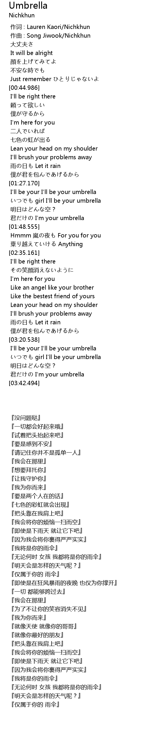 | [03:25.993] | 『无论何时 女孩 我都将是你的雨伞』 |