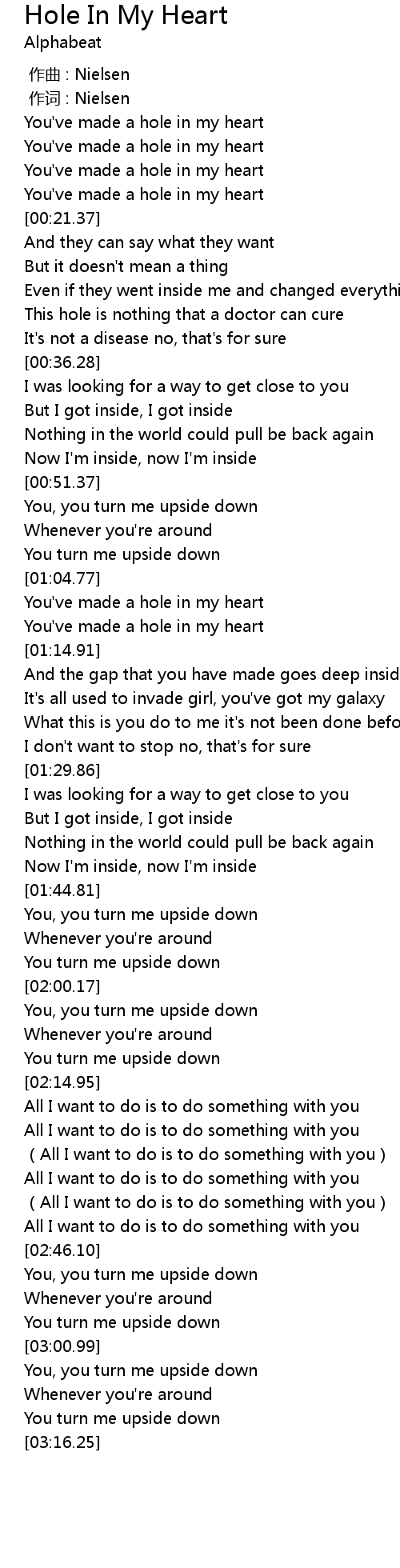 | [00:17.97] | You've made a hole in my heart |