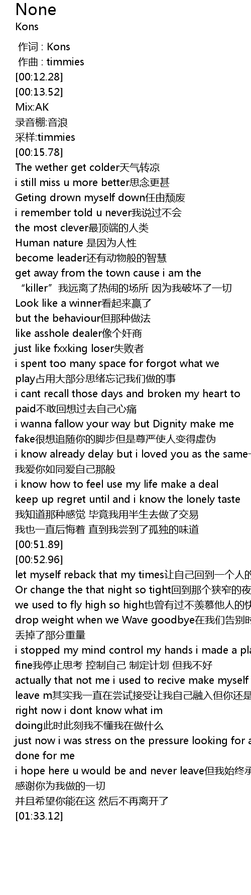 | [01:16.98] | actually that not me i used to recive make myself fit but u still leave m其实我一直在尝试接受让我自己融入但你还是离开了 |