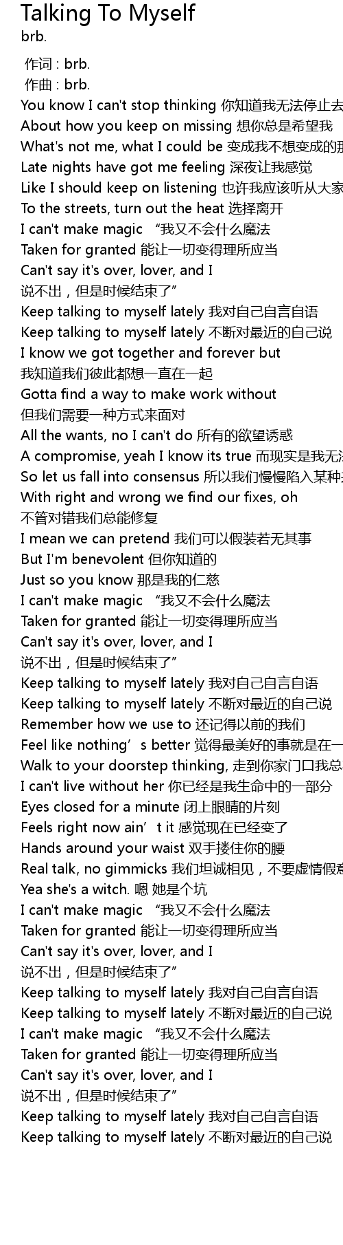 | [02:41.852] | Keep talking to myself lately 我对自己自言自语 |