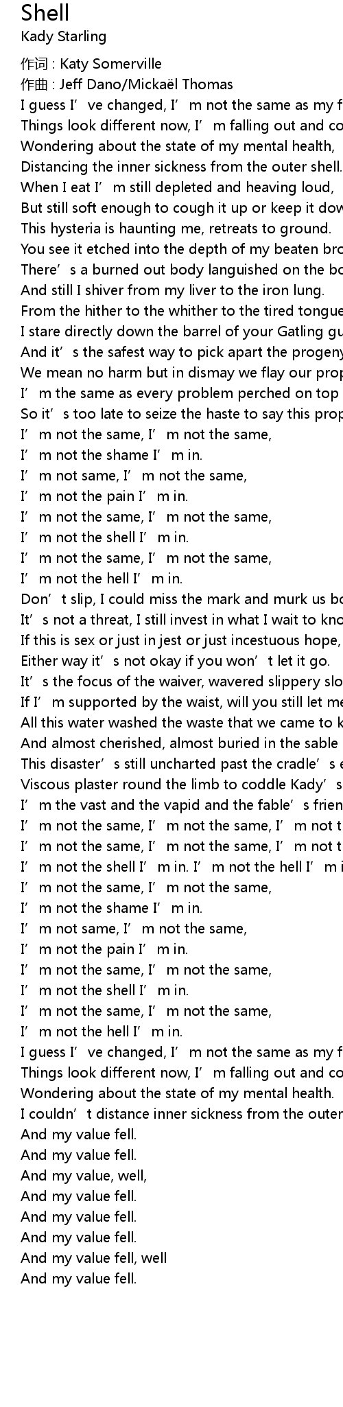 | I’m not the same, I’m not the same, I’m not the shell I’m in. | |