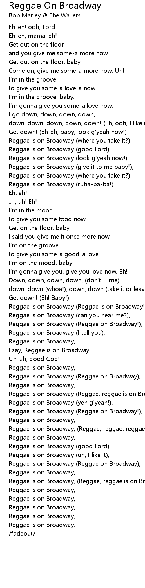 Reggae is on Broadway, (Reggae, reggae, reggae, reggae, reggae is on Broadway!) |