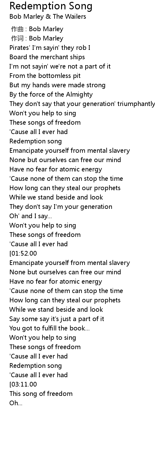 | [01:56.00][01:52.00] | Redemption song (2x) |