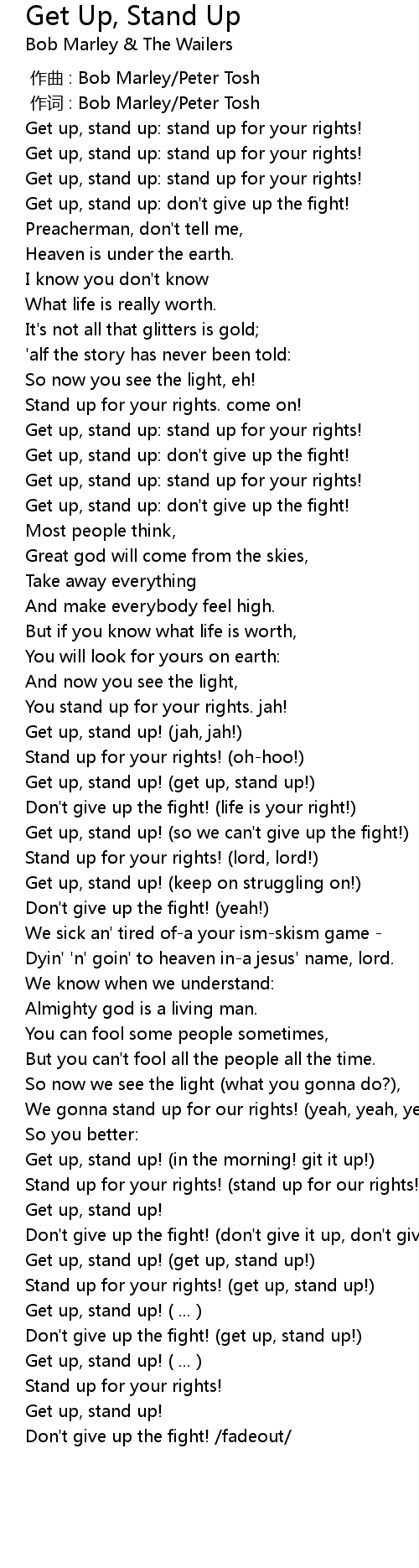 | [01:46.88] | Get up, stand up! (jah, jah!) |