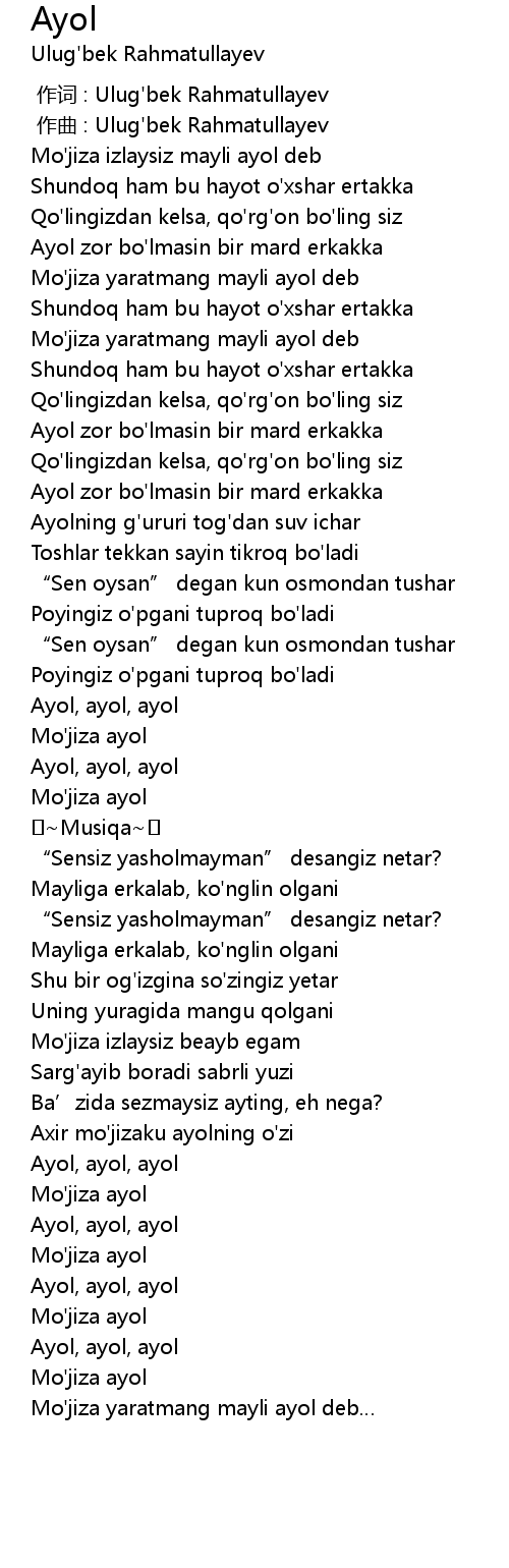| [00:40.98] | Mo' jiza yaratmang mayli ayol deb |