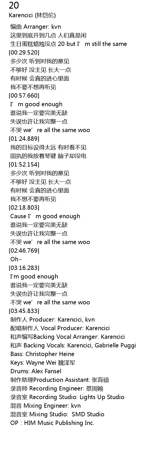 | [03:47.734] | 配唱制作人 Vocal Producer: Karencici |