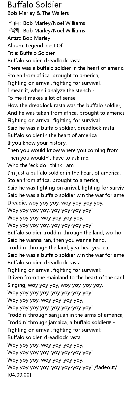 | [02:28.34] | Buffalo soldier troddin' through the land, wo-ho-ooh! |