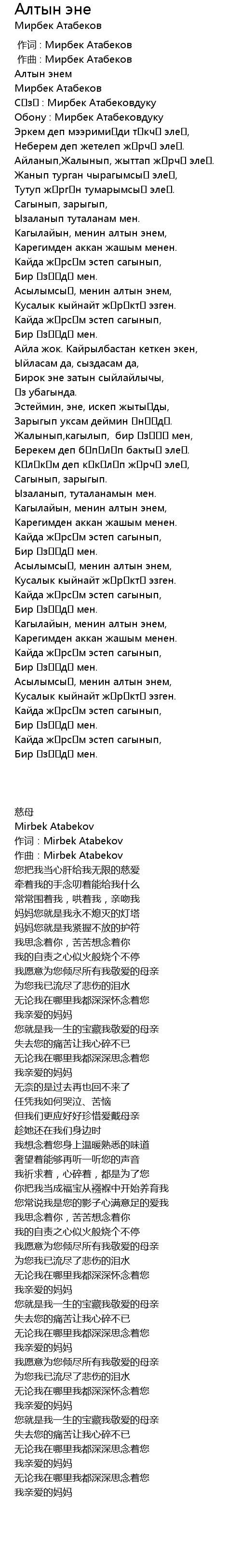 | [00:18.00] | 作词:Mirbek Atabekov |