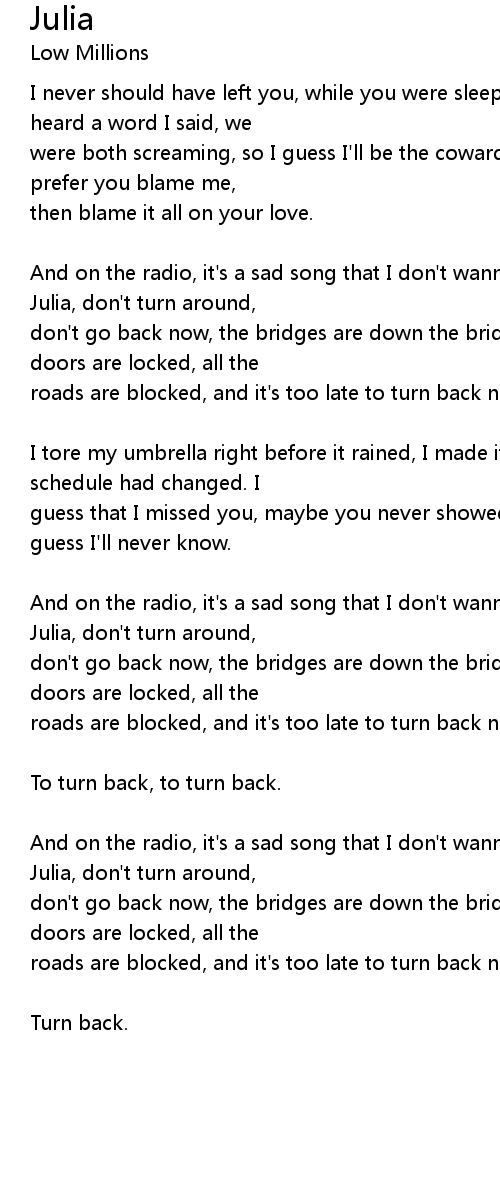 And on the radio, it's a sad song that I don't wanna hear anymore, it goes Julia, don't turn around, |