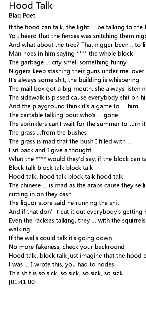 | [00:58.60] | Hood talk, hood talk block talk hood talk |