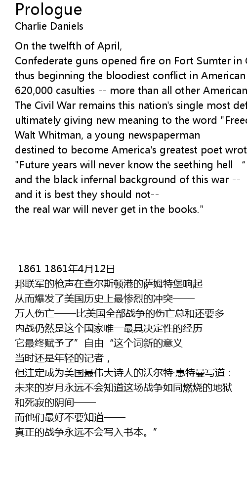 | [00:19.58] | 邦联军的枪声在查尔斯顿港的萨姆特堡响起 |