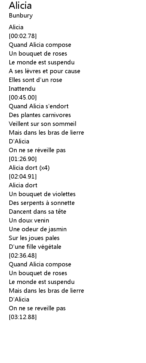 | [00:59.12] | Quand Alicia s' endort |