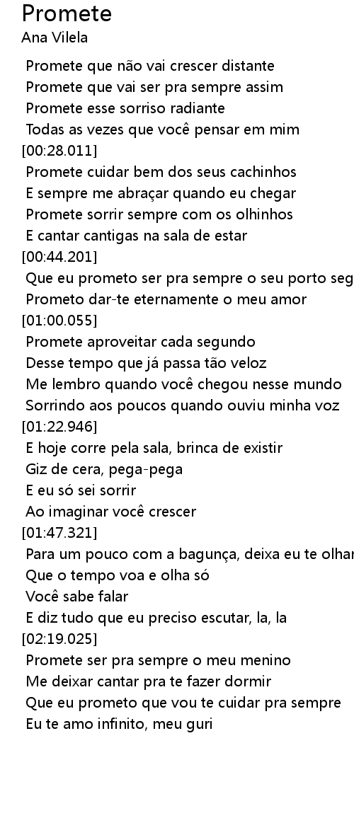 | [02:28.843] | Promete ser pra sempre o meu menino |