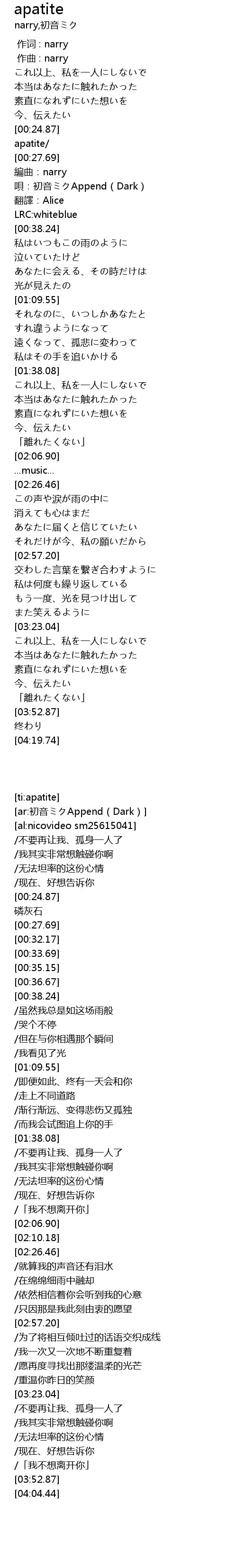 | [00:33.69] | 唄:初音ミクAppend(Dark) |