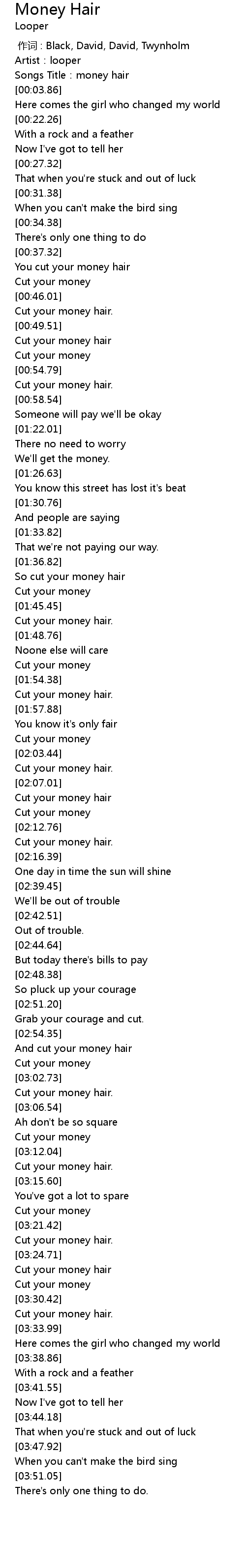 | [03:26.83] | Cut your money hair |