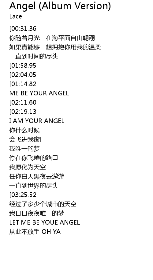 | [02:25.85][03:25.52][03:55.56][04:26.21] | I AM YUOR ANGEL |