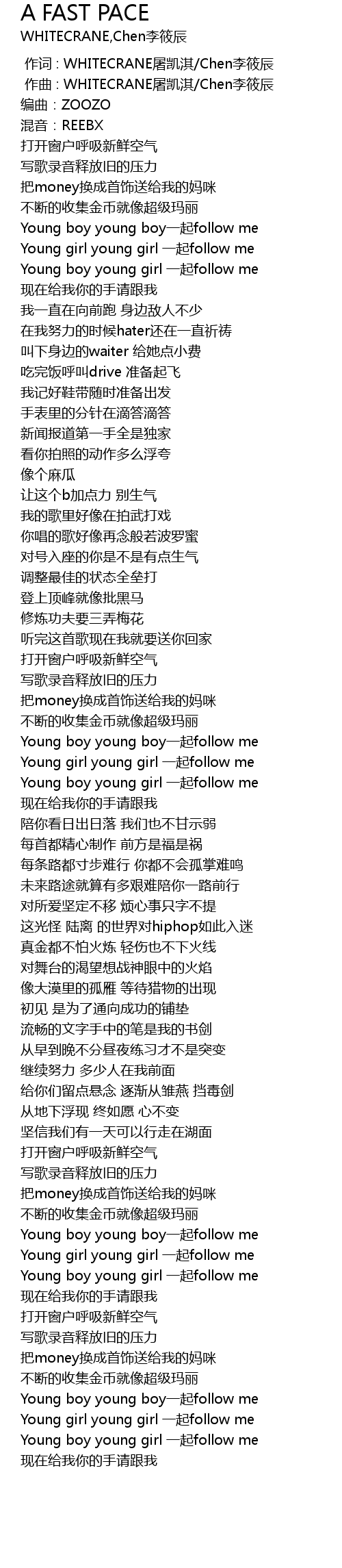 | [03:12.497] | Young boy young boy yì qǐ follow me |