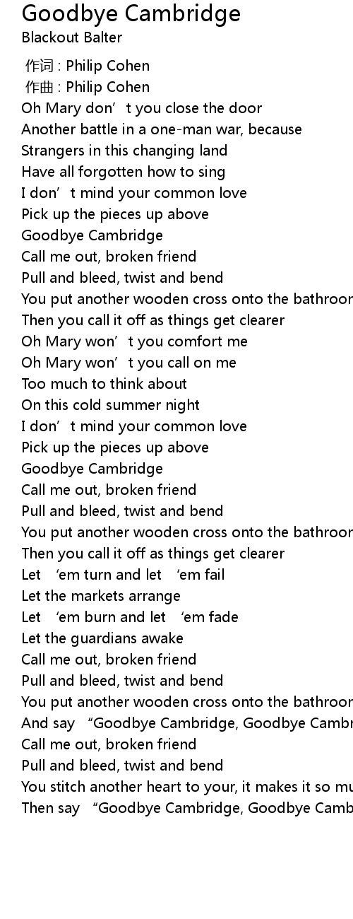 | [03:18.179] | Then say “Goodbye Cambridge, Goodbye Cambridge” |