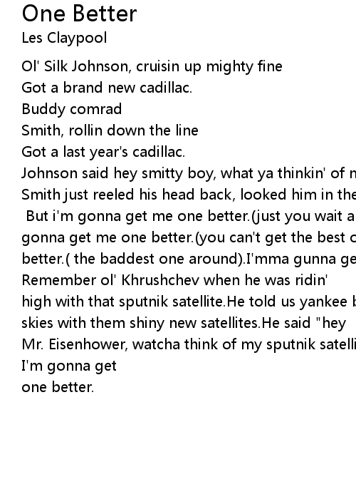Smith just reeled his head back, looked him in the eye, "that's a mighty fine cadillac.[chorus] But i'm gonna get me one better.(just you wait and see).I'mma gonna get me one better.(you can't get the best of me).I'mma gonna get me one better.( the baddest one around).I'mma gunna get me one better.( 'cause' i got the biggest balls in town).[chorus]Remember ol' Khrushchev when he was ridin' high with that sputnik satellite.He told us yankee boys, he's gunna fill the skies with them shiny new satellites.He said "hey |