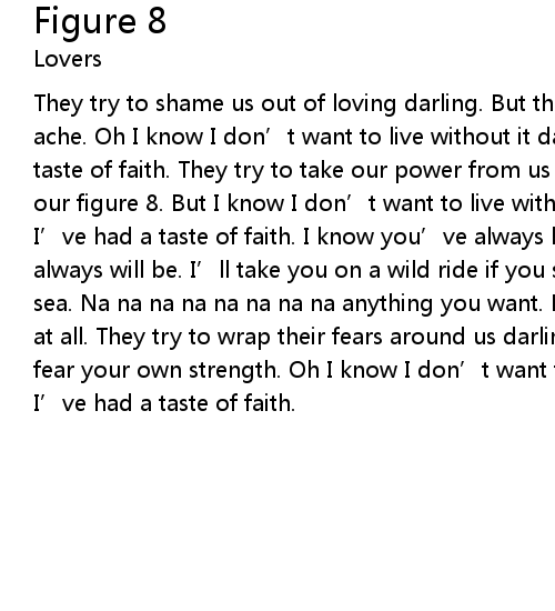 | They try to shame us out of loving darling. But they don’t pray as hard as I ache. Oh I know I don’t want to live without it darling. I know I’ve had a taste of faith. They try to take our power from us darling. They try to break our figure 8. But I know I don’t want to live without it darling. I know I’ve had a taste of faith. I know you’ve always been on my side. I know you always will be. I’ll take you on a wild ride if you slip your ship into my sea. Na na na na na na na na anything you want. Na na na na na na na na anything at all. They try to wrap their fears around us darling, but they cant make you fear your own strength. Oh I know I don’t want to live without it. I know I’ve had a taste of faith. |