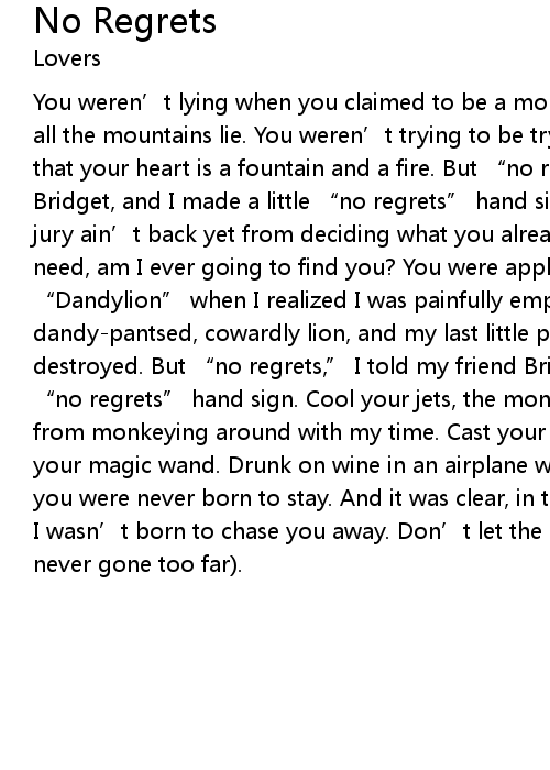 | You weren' t lying when you claimed to be a mountain lion under the sky where all the mountains lie. You weren' t trying to be trying when you were denying that your heart is a fountain and a fire. But " no regrets," I told my friend Bridget, and I made a little " no regrets" hand sign. Call your bets, the jury ain' t back yet from deciding what you already decided. If I know what you need, am I ever going to find you? You were applying a lip gloss shade named " Dandylion" when I realized I was painfully employed as your benign, dandypantsed, cowardly lion, and my last little piece of pride, it was destroyed. But " no regrets," I told my friend Bridget, and I made a little " no regrets" hand sign. Cool your jets, the monkey' s coming back I bet from monkeying around with my time. Cast your spell, turn me on, touch me with your magic wand. Drunk on wine in an airplane with a fear of flying I realized you were never born to stay. And it was clear, in the foggy, endless atmosphere, I wasn' t born to chase you away. Don' t let the moon go down on you I' m never gone too far. |