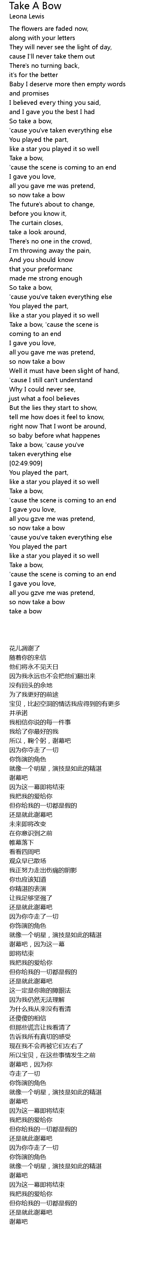 | [02:45.219] | Take a bow, ' cause you' ve |
