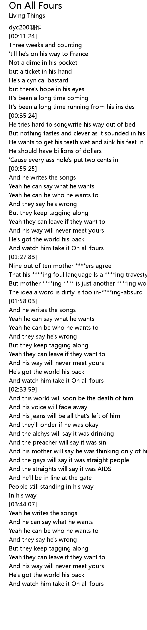 | [01:44.89] | That his ****ing foul language Is a ****ing travesty |