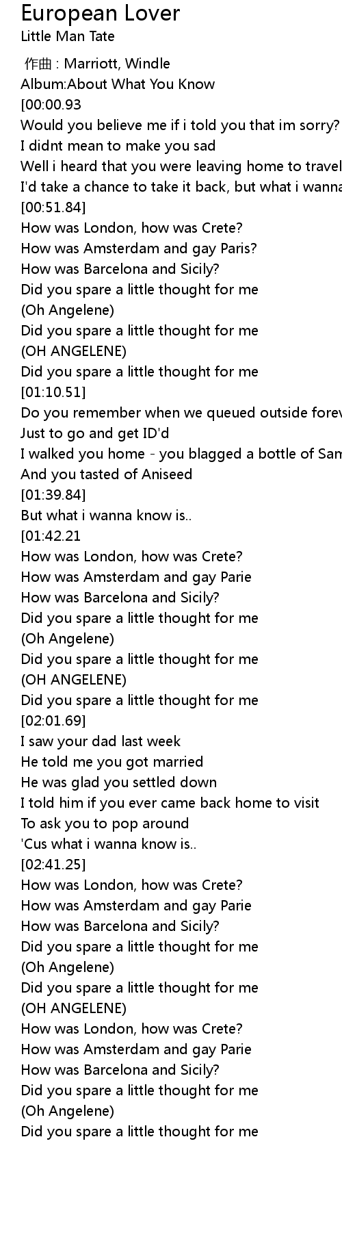 | [00:54.66] | How was Amsterdam and gay Paris? |