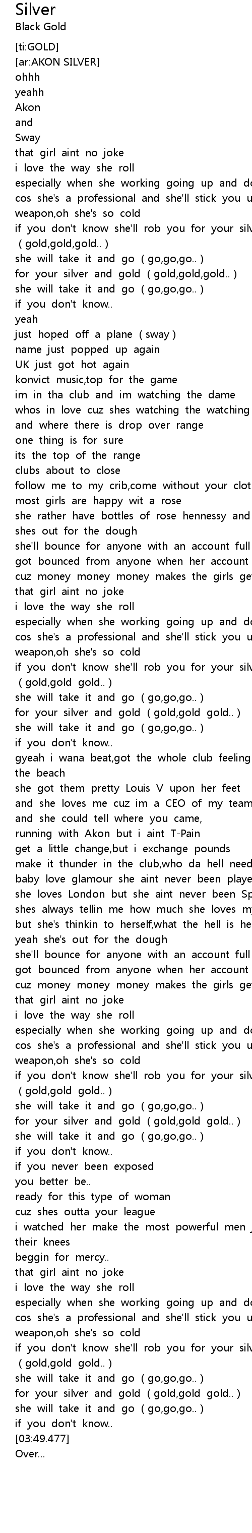 | [01:34.183] | if you don' t know she' ll rob you for your silver and gold gold, gold gold.. |