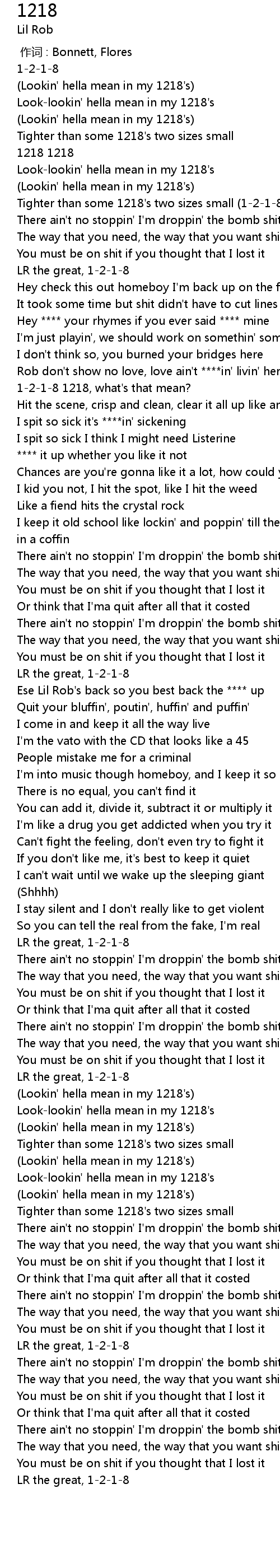 | [00:16.55] | (Lookin' hella mean in my 1218's) |