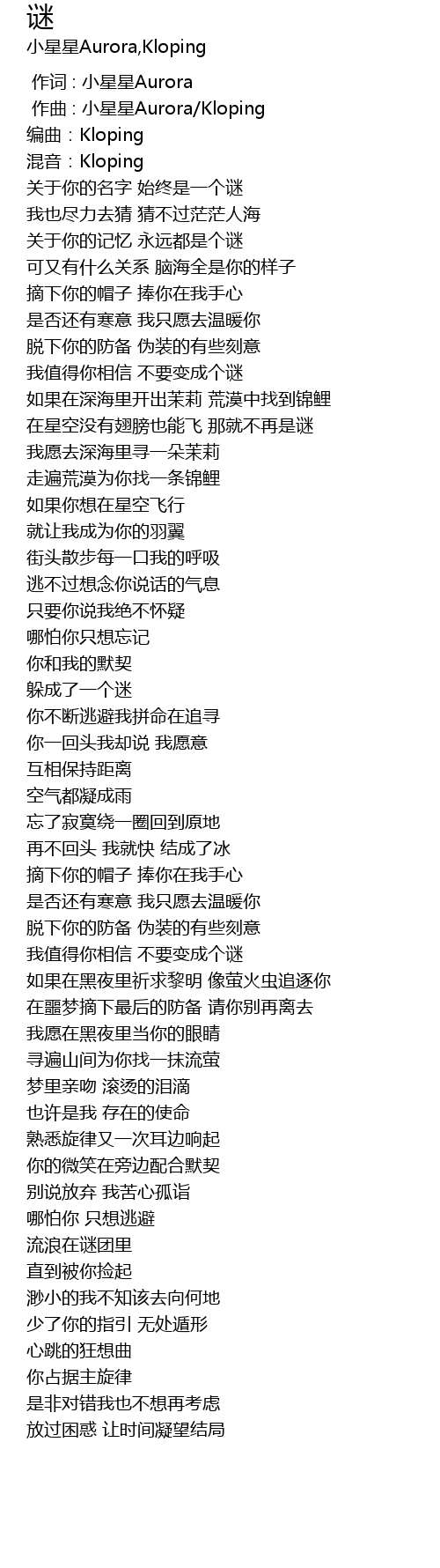 | [00:01.000] | 作曲 : 小星星Aurora/Kloping |