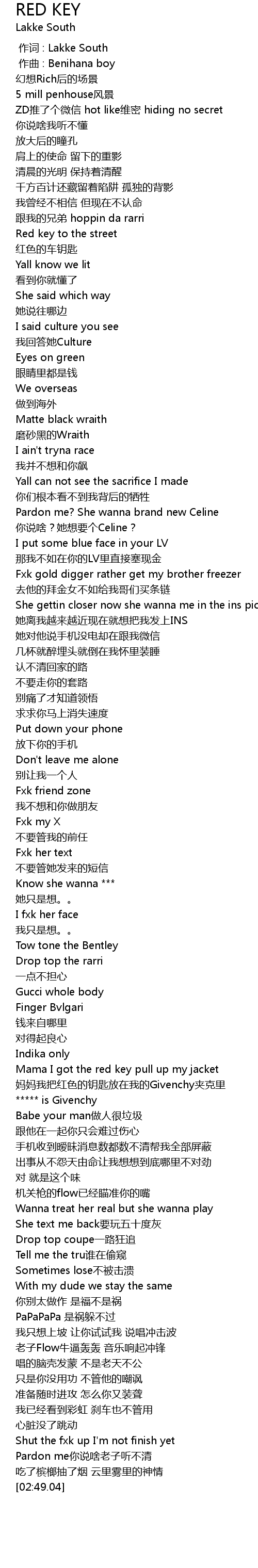 | [01:51.08] | 妈妈我把红色的钥匙放在我的Givenchy夹克里 |