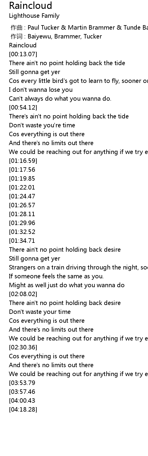 | [04:08.91][04:00.43][03:52.33][03:44.30] | Under a raincloud |