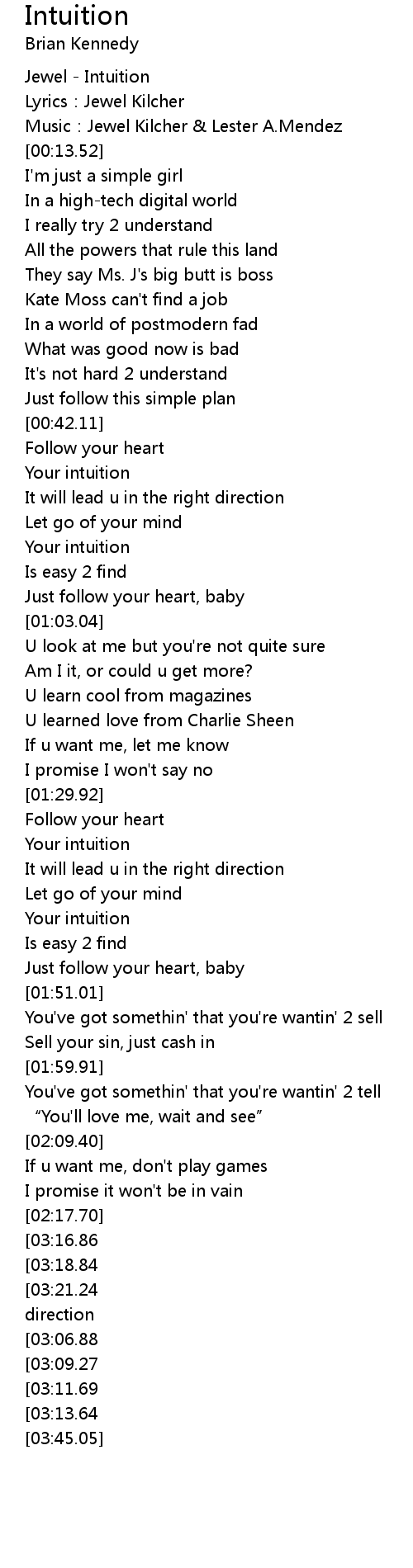 | [03:37.92][03:18.84][02:59.69][02:40.61][02:21.49] | Your intuition |