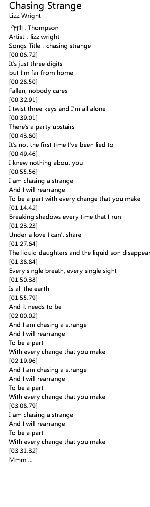 | [00:03.83] | Songs Title: chasing strange |