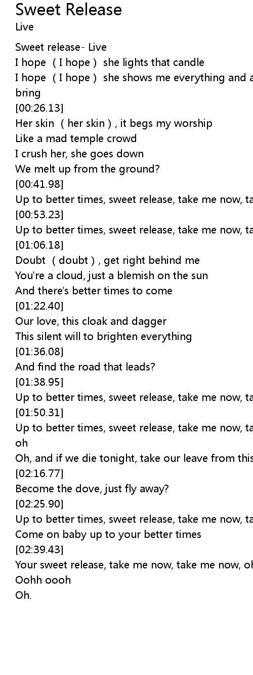 | [02:26.78] | Up to better times, sweet release, take me now, take me now |