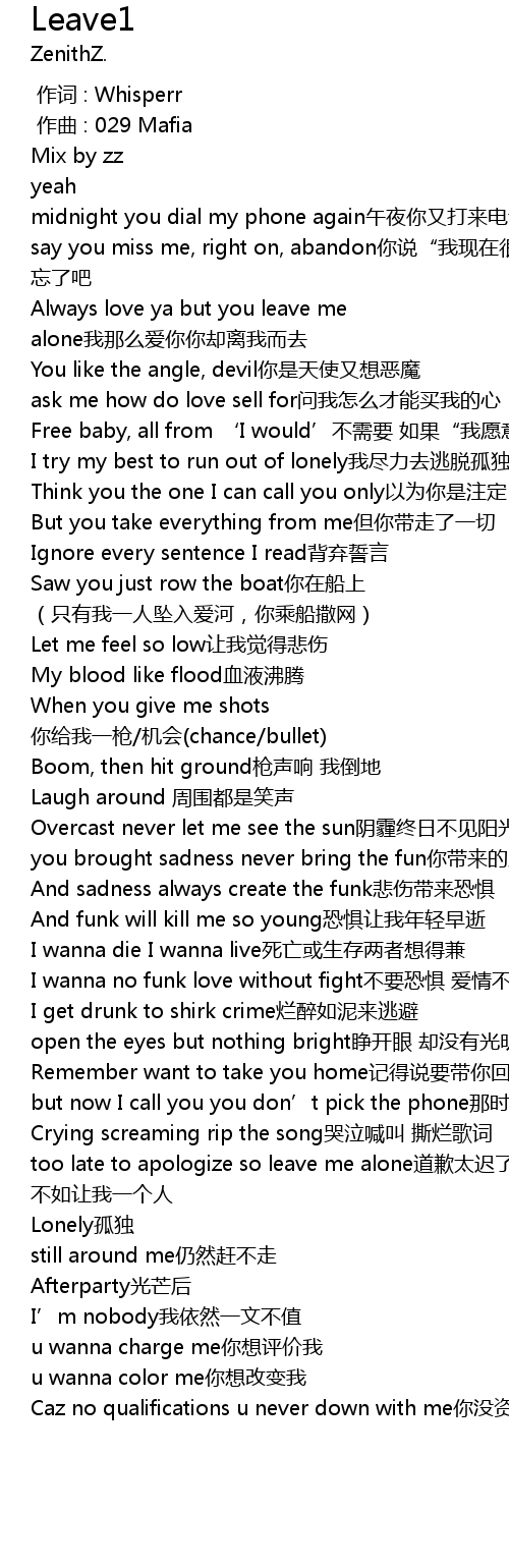 | [00:21.672] | Always love ya but you leave me alone wǒ nà me ài nǐ nǐ què lí wǒ ér qù |