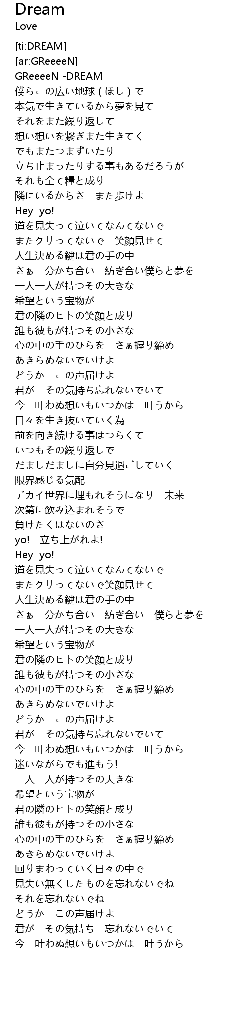 | [00:49.646] | さぁ 分かち合い 紡ぎ合い僕らと夢を |