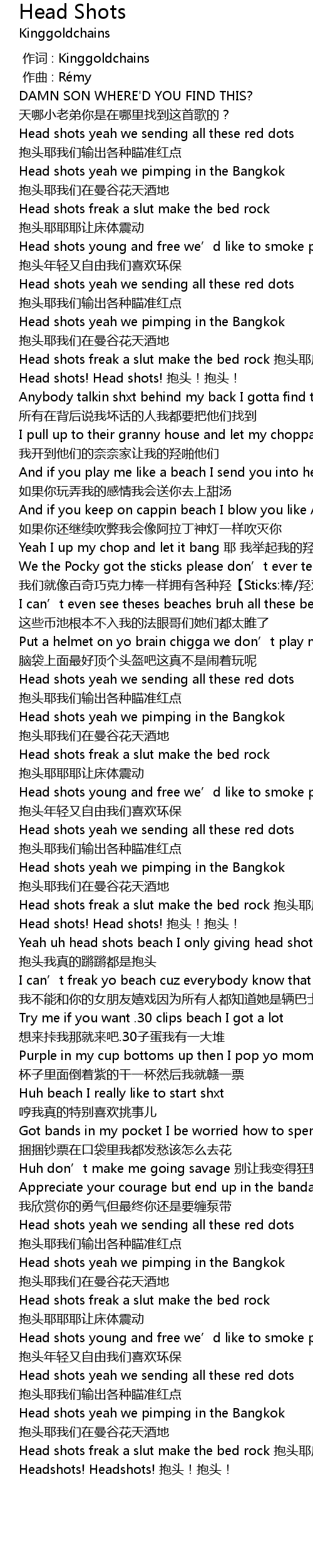 | [01:05.652] | Head shots freak a slut make the bed rock bao tou ye ye ye rang chuang ti zhen dong |